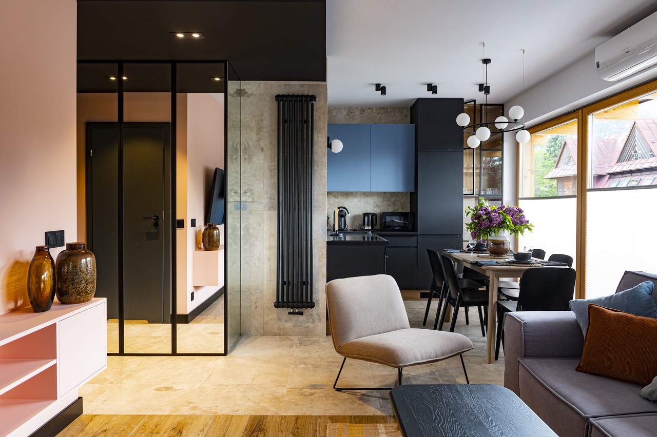 Największym błędem w aranżacji małych mieszkań jest próba wydzielenia osobnych pomieszczeń za pomocą tradycyjnych ścian działowych. Murowane przegrody zabierają cenne centymetry, blokują dopływ naturalnego światła i sprawiają, że wnętrze staje się klaustrofobiczne. Zamiast tego, nowoczesne projekty stawiają na strefowanie optyczne i mobilne. Jak to zrobić oryginalnie? Można wykorzystać ażurowe regały, które pełnią funkcję biblioteki, a jednocześnie subtelnie oddzielają część sypialnianą od dziennej. Innym rozwiązaniem są szklane ścianki z czarnymi szprosami – nadają one wnętrzu industrialny charakter, nie ograniczając przy tym przestrzeni wizualnej.